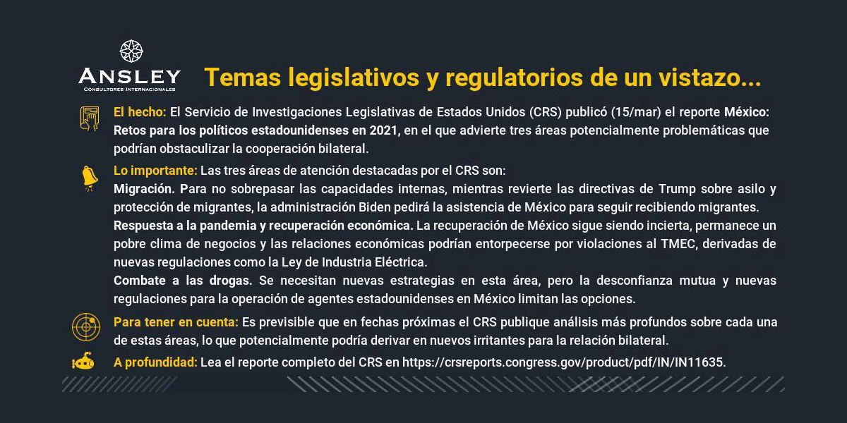 El servicio de investigaciones legislativas de Estados Unidos (CRS) publicó el reporte México: Retos para los políticos estadounidenses 2021, en el que advierte 3 áreas potencialmente problemáticas...